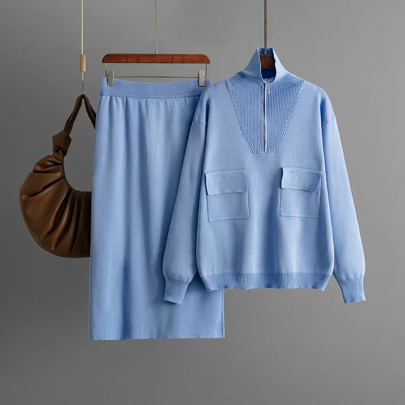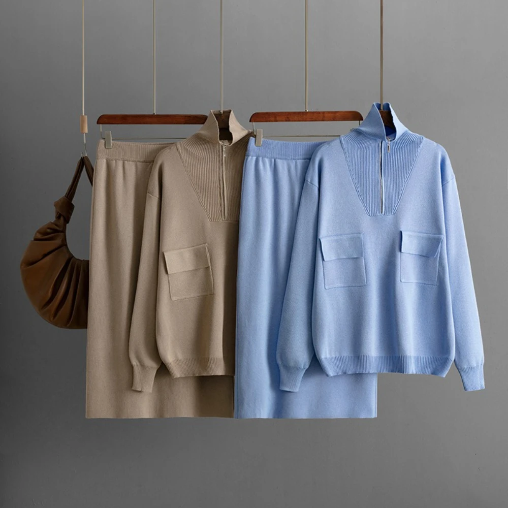 Blubelle Winter Casual Solid Half-Zip Knitted Set Women Ankle-Length Pocketed Sweater + Midi Skirt Two-piece Outfit
